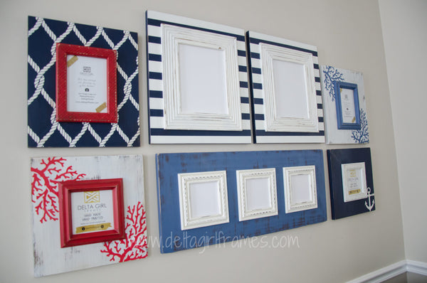 2-5×7, 4″ frames (12×14″ overall) one created in Dover White wash with Denim Coral pattern finished in a Denim colonial trim and the other created using a Naval base with Dover White Rope pattern with a Heartthrob Herribgbone Trim