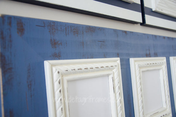 2- 8×10, 4″ frames (15×17″ overall) in a Naval base with Dover White continuing stripes and finished with a Dover White rail trim