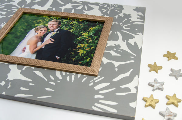 Shown above as a 11×14, 6″ frame based in Westchester Gray with a Flora pattern in Agreeable Gray and finished with a rose gold herringbone trim.  This beauty is only available in 11×14 and 16×20!