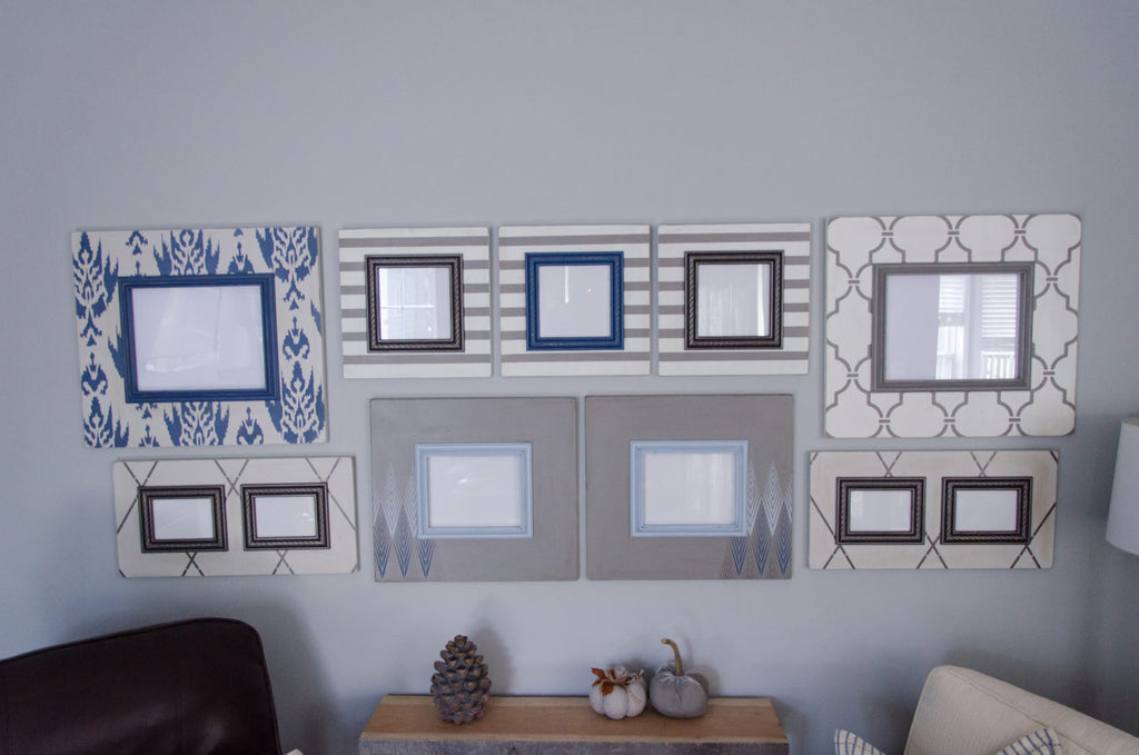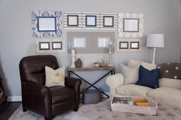 2-6″, 11×14 Frames- One based in Agreeable Gray base with Denim Ikat and finished in a Denim Colonial trim. The second is based in Dover White base with a Dovetail trellis patter and Dovetail Colonial trim.